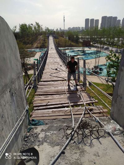 吊桥生产厂家总体布置本桥全长115.116m,宽249m,桥面下共设4根6x55wNS+WR4621670钢芯钢丝绳承重索,承重索两侧各设2根6x55sWS+WR621670钢芯钢丝绳,作为稳定索。